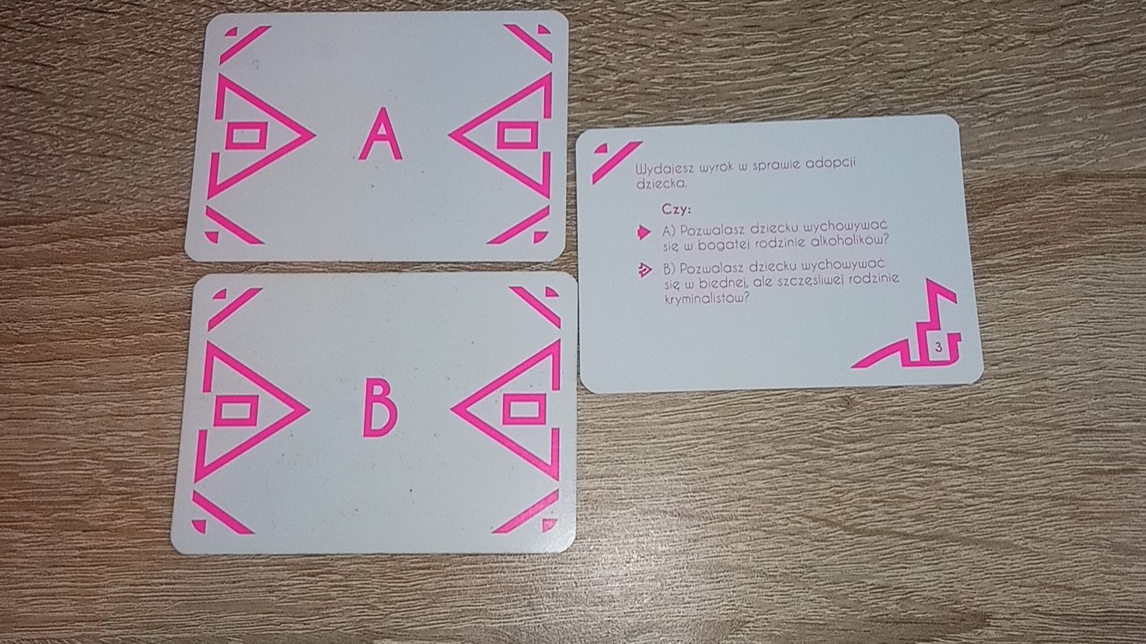 W każdej turze na stole ląduje karta Dylematu: zagadnienia moralnego z dwoma możliwymi rozwiązaniami. Twoim zadaniem jest przewidzieć, którą opcję wybierze większość osób przy stole. Grupa może – a nawet powinna, gorąco do tego zachęcamy! – dyskutować nad możliwymi rozwiązaniami, po czym każdy z graczy podejmuje decyzję. Punktujesz, jeśli udało Ci się poprawnie przewidzieć głos większości. Ostatecznym celem gry jest zebranie 5 punktów, ale sekret dobrej zabawy polega na rozmowie. Karty mają stanowić pretekst do dyskusji na mniej lub bardziej odjechane tematy.